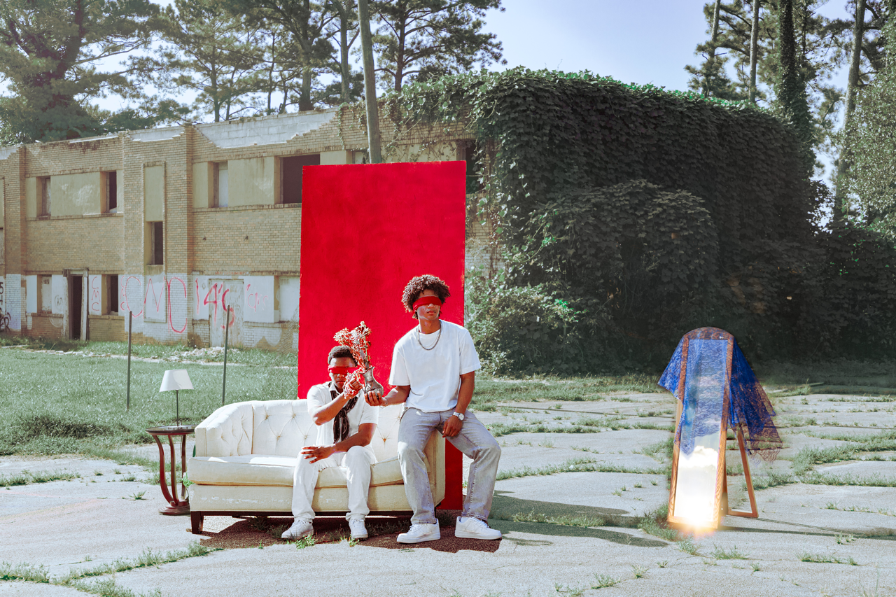 DREAMS, DEFERRED. depicts two Americans sitting on a white couch, a red wall of plywood behind them. To the right, a piece of Ol’ Glory Blue colored lace appears to float. There’s another piece on that blows in the wind off the plywood, and a a third that appears to hover in front of the rotting church. The two American men, one seated on the couch arm, one on the couch, are blindfolded. They hold a vase of dead flowers, together.